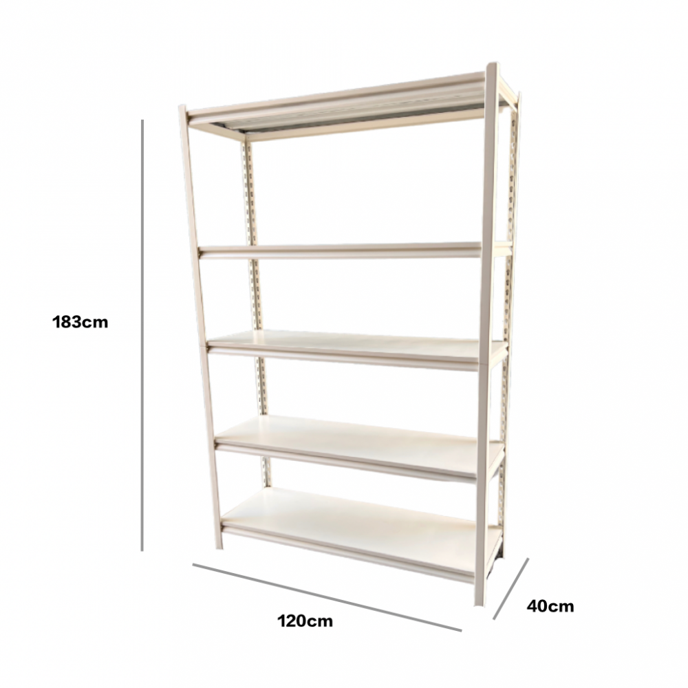 ●寬120cm 高183cm 深40cm ●五層碳鋼烤漆板,表層噴塗加強處理更耐刮 ●每層載重100KG ●可自由調整層板及側欄高度 ●可拆兩組90公分架使用 ●內葫蘆孔結構,更美觀