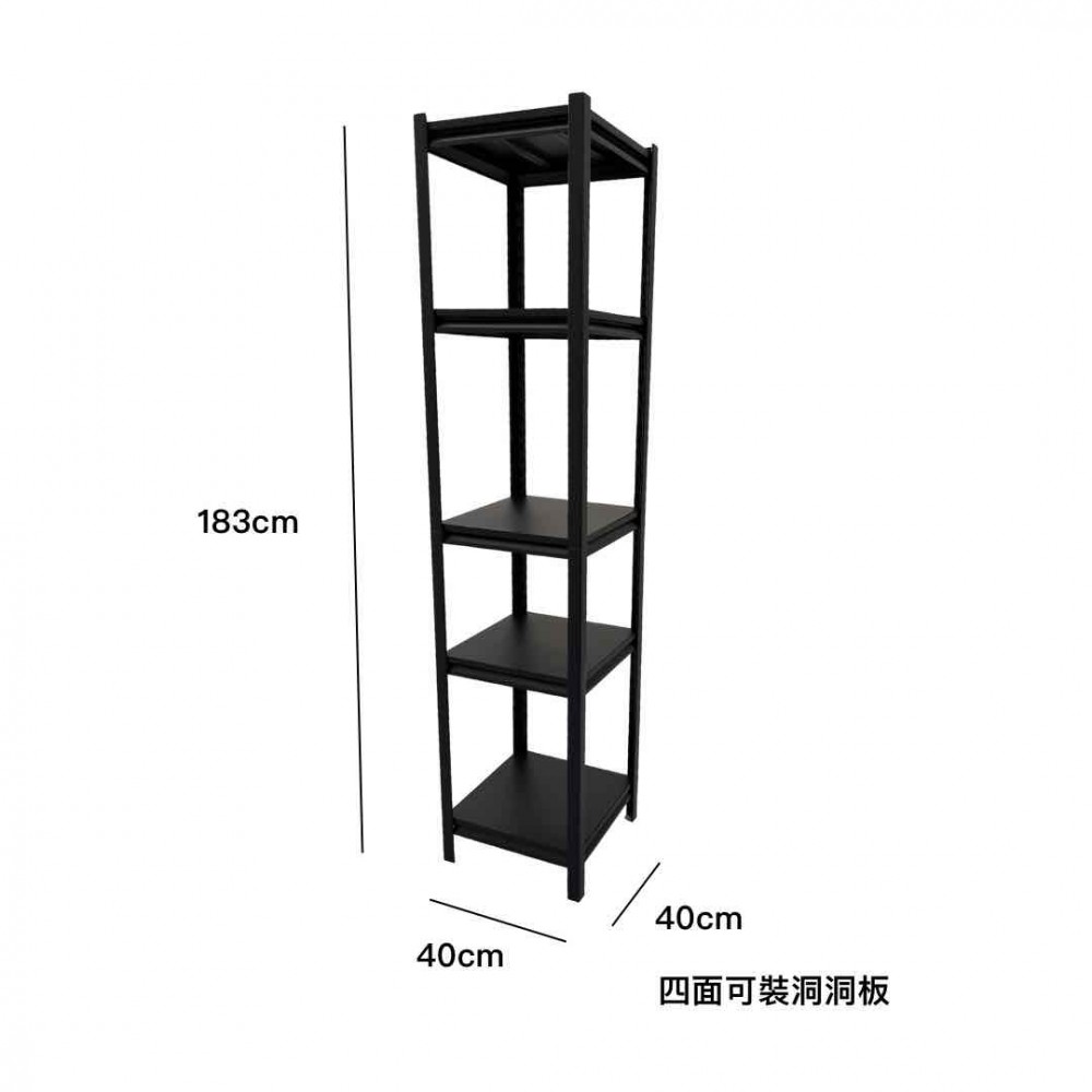 ●寬40cm 高183cm 深40cm ●五層碳鋼烤漆板,表層噴塗加強處理更耐刮 ●每層載重100KG ●可自由調整層板及側欄高度 ●內葫蘆孔結構,更美觀